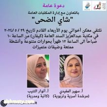 حضور الناشطه المتألقه خالده المسباح دعوه عامه بالتعاون مع إدارة المكتبات العامه "شاي الضحى "كل يوم الإربعاء ١٠ صباحا مكتبة عبدالعزيز السند كيفان لي الساعه ١٢ظهرا حوارات متنوعه وانشطه ممتعه وضيفات متميزات الأستاذه سهير المفيدي مرشده أسريه وتربوية والأستاذه أنوار التنيب كاتبه ومدربه
