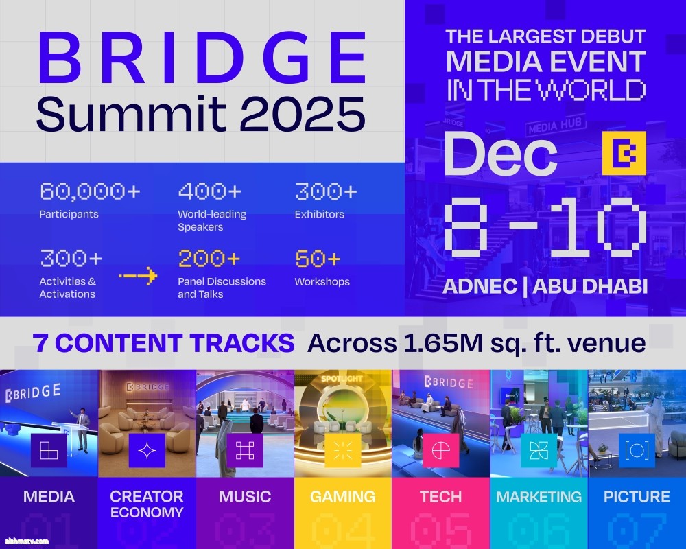 أعلن المكتب الوطني للإعلام في دولة الإمارات العربية المتحدة عن إطلاق "قمة بريدج"، الحدث الأضخم في صناعة الإعلام والمحتوى والترفيه على مستوى العالم، في العاصمة أبوظبي، خلال الفترة من 8 إلى 10 ديسمبر 2025 في مركز أبوظبي الوطني للمعارض (أدنيك)، أكبر مركز من نوعه في المنطقة، بمساحة تتجاوز 1.65 مليون قدم مربع موزعة على سبعة مسارات للمحتوى، كاشفاً بذلك عن أكبر منصة عالمية تجمع قادة ونخبة صُنّاع الإعلام والمحتوى الإعلامي والثقافي والفني بكافة مكوناتهم، إلى جانب صُنّاع القرار، لتمكين تواصل أكثر فاعلية وتكاملاً على مستوى العالم.