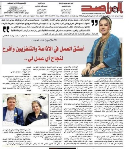 اعلامية رائدة ، عملت سنوات طوال في مجالي الاذاعة والتلفزيون ، قدمت العديد من البرامج وتفوقت بها في زمن كانت القنوات محدودة في العراق والتي تعرف بقناتي ( ٧ و ٩ ) اتجهت الى كتابة الشعر ونتج عنها منجزات مطبوعة ، تنوعت ثقافتها من خلال كتابة المقال ، اذ نشرت لها العديد من الصحف العراقية والعربية ، أشاد بمنجزاتها الكثير من النقاد العراقيين والعرب ، حضورها مستمر في الجلسات الثقافية ، فهي ركن مهم من أركان الحركة الثقافية العراقية ، ضيفتي الاعلامية العراقية هند احمد ، كانت معي عبر هذا الحوار :